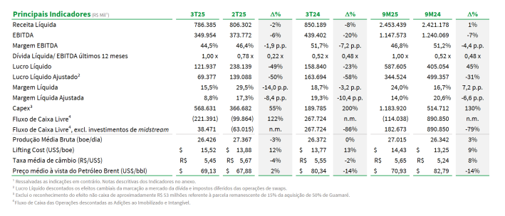 Aumento de Custos: O Custo Total e Despesas no 3T25 foram de R$ 384 milhões, 3% acima do trimestre anterior. Os custos de Serviços e Materiais aumentaram 20%, devido ao aumento de reparos de poços e integridade de ativos.